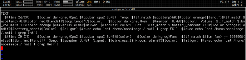 Below you can see my Conky in action with an urxvt terminal with Vim showing the last part of my “.conkyrc” configuration file (the part that creates what you see on my Conky).