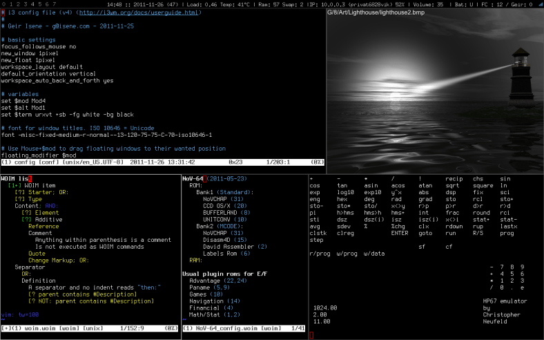 One of the perks of running a company like FreeCode is that I get to work with some amazing tech people. The other day Kim Tore showed me his Window Manager (yeah, it was like “I show you mine if you show me yours”). It was awesome. It was “tiling” – where the WM takes automatic care of window placement. But with a config file in Lua(!), it wasn’t awesome enough. But my interest was sparked, like back in the days of exploration where I was on my big WM hunt.