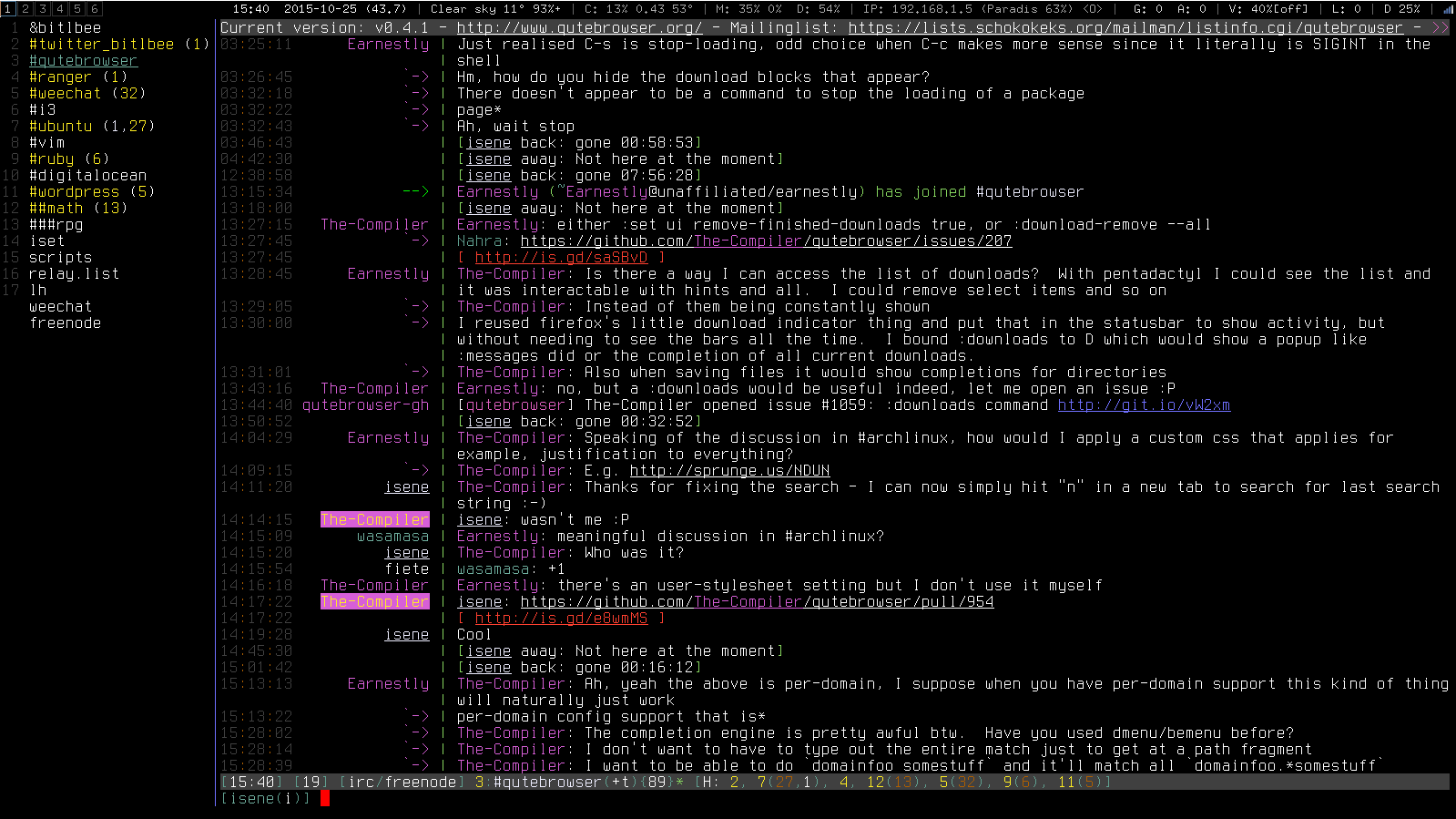 ‘gratz. Last time I tried out weechat, it bogged down in the several channels I normally lurked in (300+ users each). These days, I just use irssi with nicklist (in fifo mode) to provide the side bar, and byobu-tmux to provide the second buffer for nicklist. It seems to be more stable than nicklist-screen and faster than weechat was.