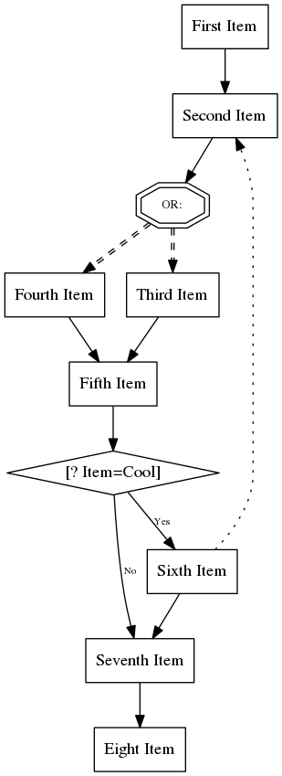 You can now automatically graph a HyperList as either a mindmap (for HyperLists that are State descriptions) or a flowchart (for HyperLists that are Transitions descriptions). An example should suffice – this dummy HyperList: